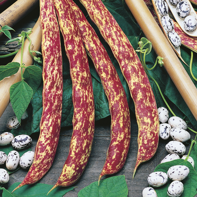 Puolikorkea, tarvitsee tuennan. Kasvuaika noin 90 vrk. Värikkäät palot, kermanvalkoisella pohjalla viininpu- naisia täpliä, 13–14 cm pitkiä, kussakin 6–7 kpl saman värityksen omaavaa siementä.
