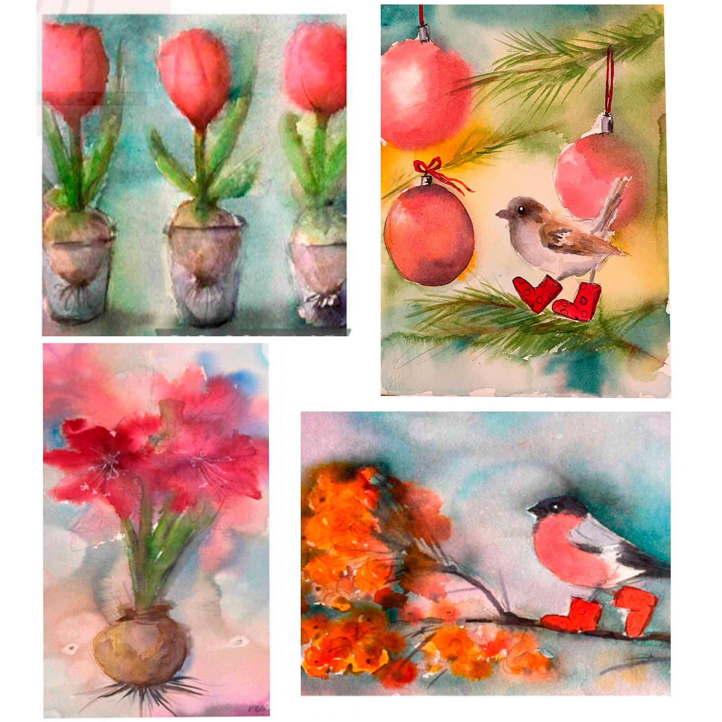 Karolina Lohinivan ihastuttavasti piirretyt kuvakortit, neljän kortin sarja Korttien tausta on puhdas valkoinen, tekstitön. Koko 13,9 x 10,6 cm