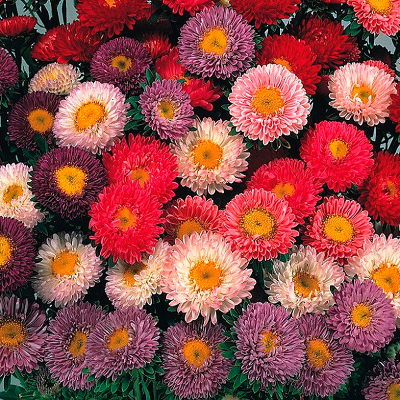Tiheään kerrotut kukat keltaisella keskusmykeröllä ovat upea värisekoitus pinkkiä, punaista, purppuraa ja valkoista. Korkeus noin 30 cm.