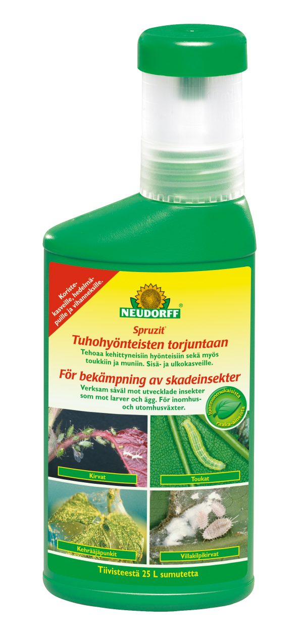 Tehokas torjunta-aine lehtikirvojen, kilpikirvojen, villakilpikirvojen, kehrääjäpunkkien, jauhiaisten, ripsiäisten ja laulukaskasten torjuntaan sekä suojaamaan koristekasveja. Spruzit tehoaa myös kovakuoriaisiin ja lehtipistiäisiin.